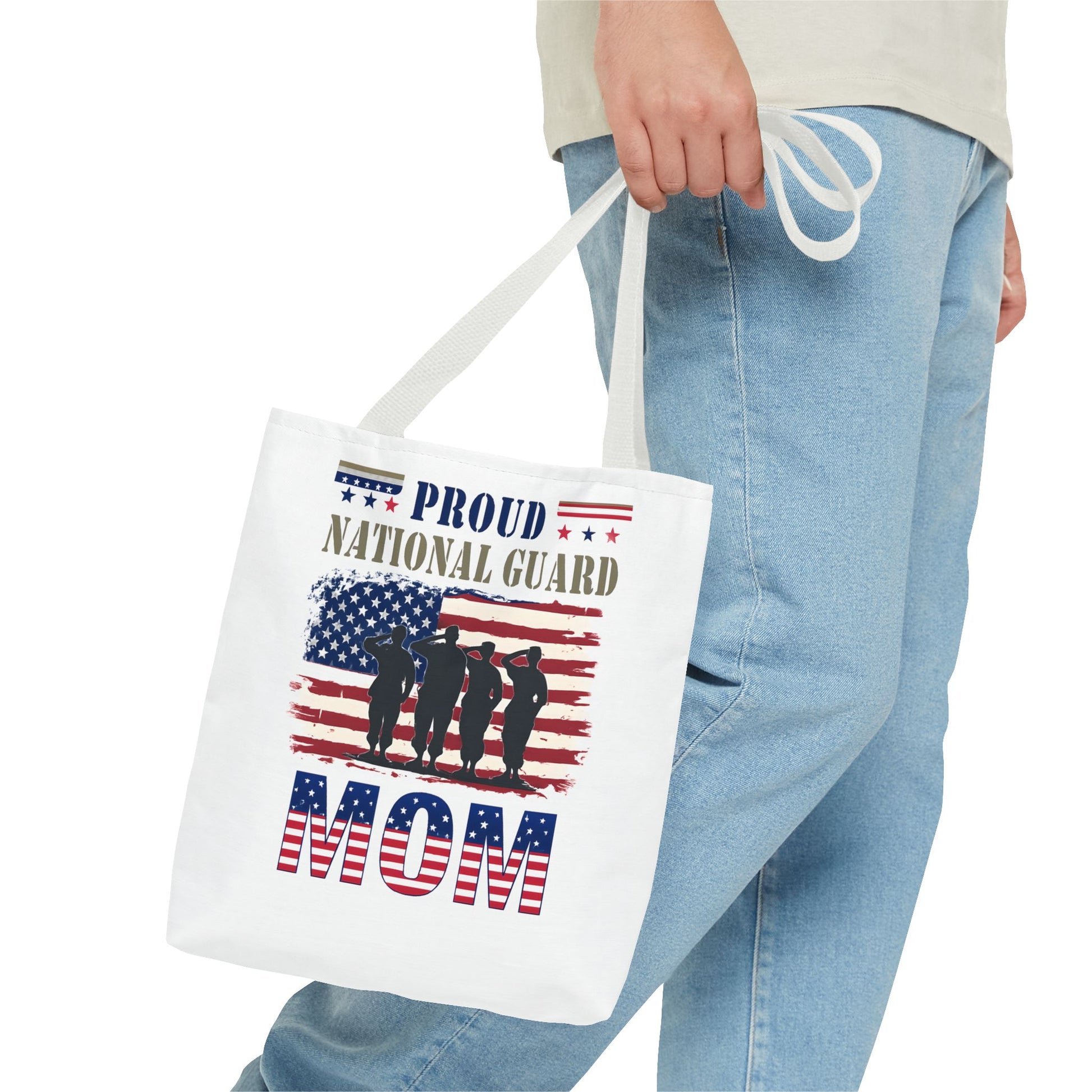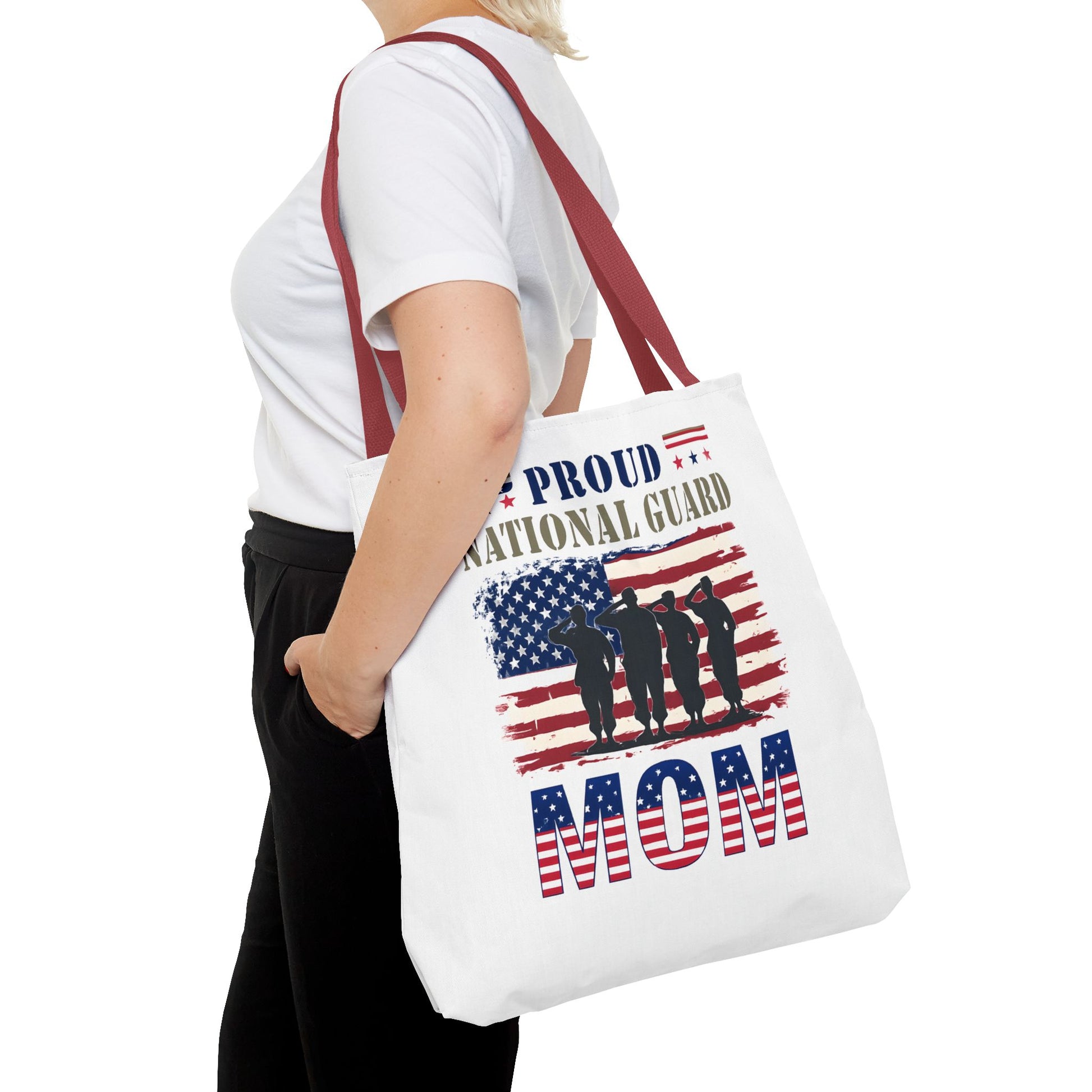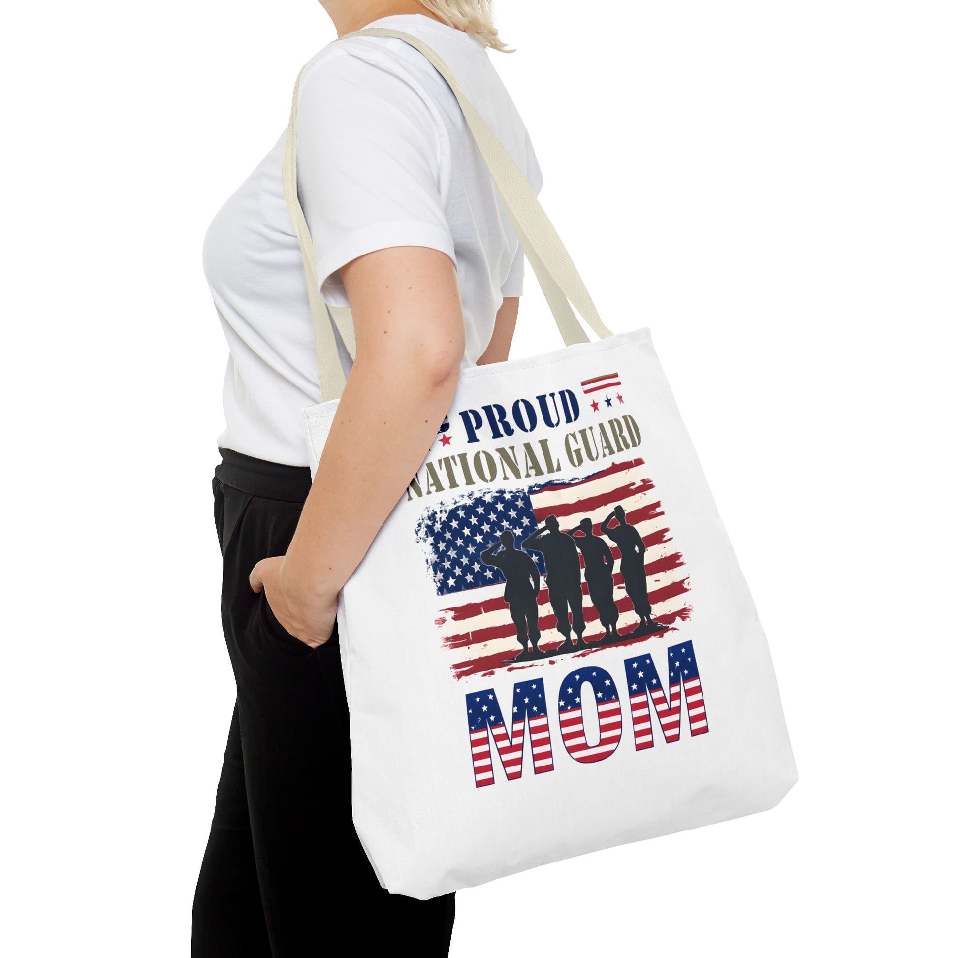 Lightweight and durable, this tote bag is perfect for carrying essentials whether you're heading to a National Guard event or simply running errands. And don’t worry air force moms, there’s room for you too. Every stitch speaks of our unwavering support for military families, ensuring you carry not just your belongings, but also your heartfelt military support wherever you go.