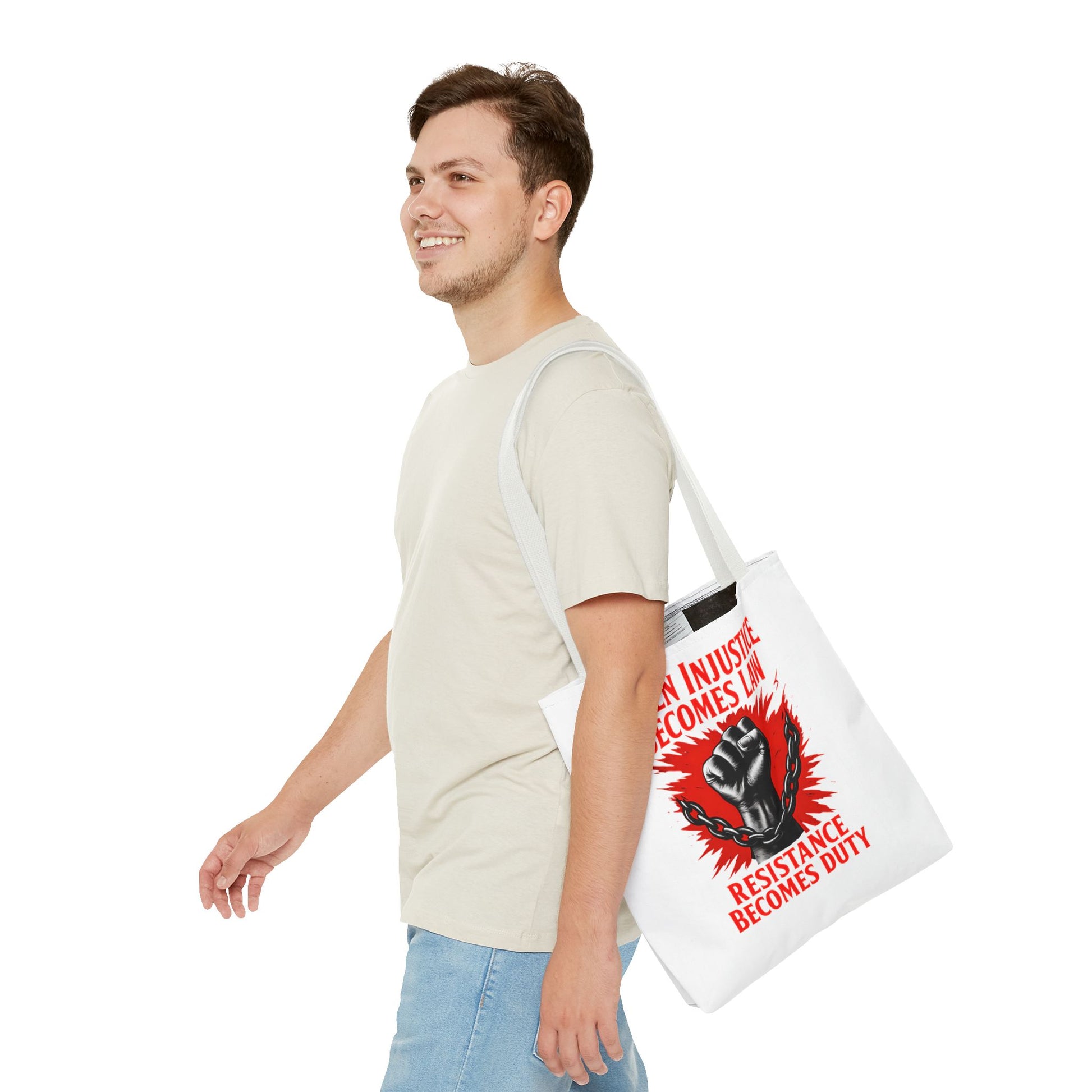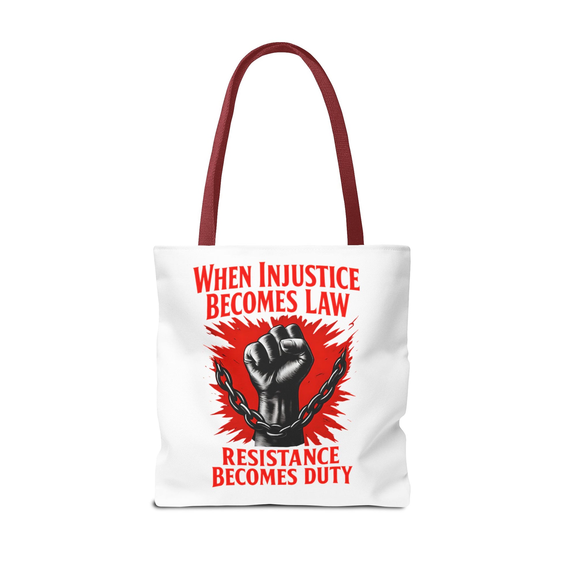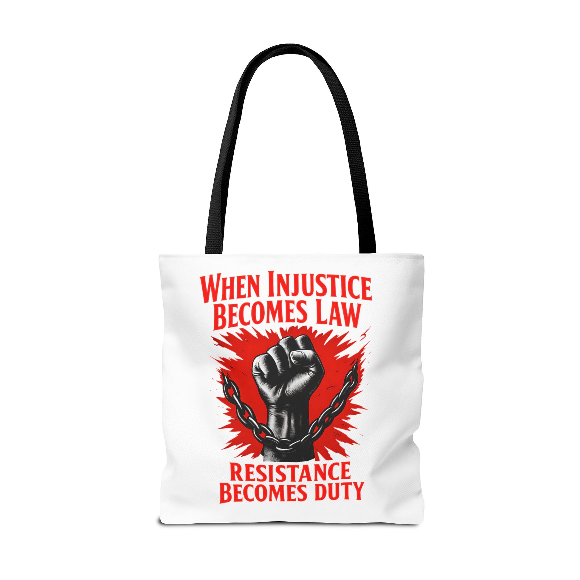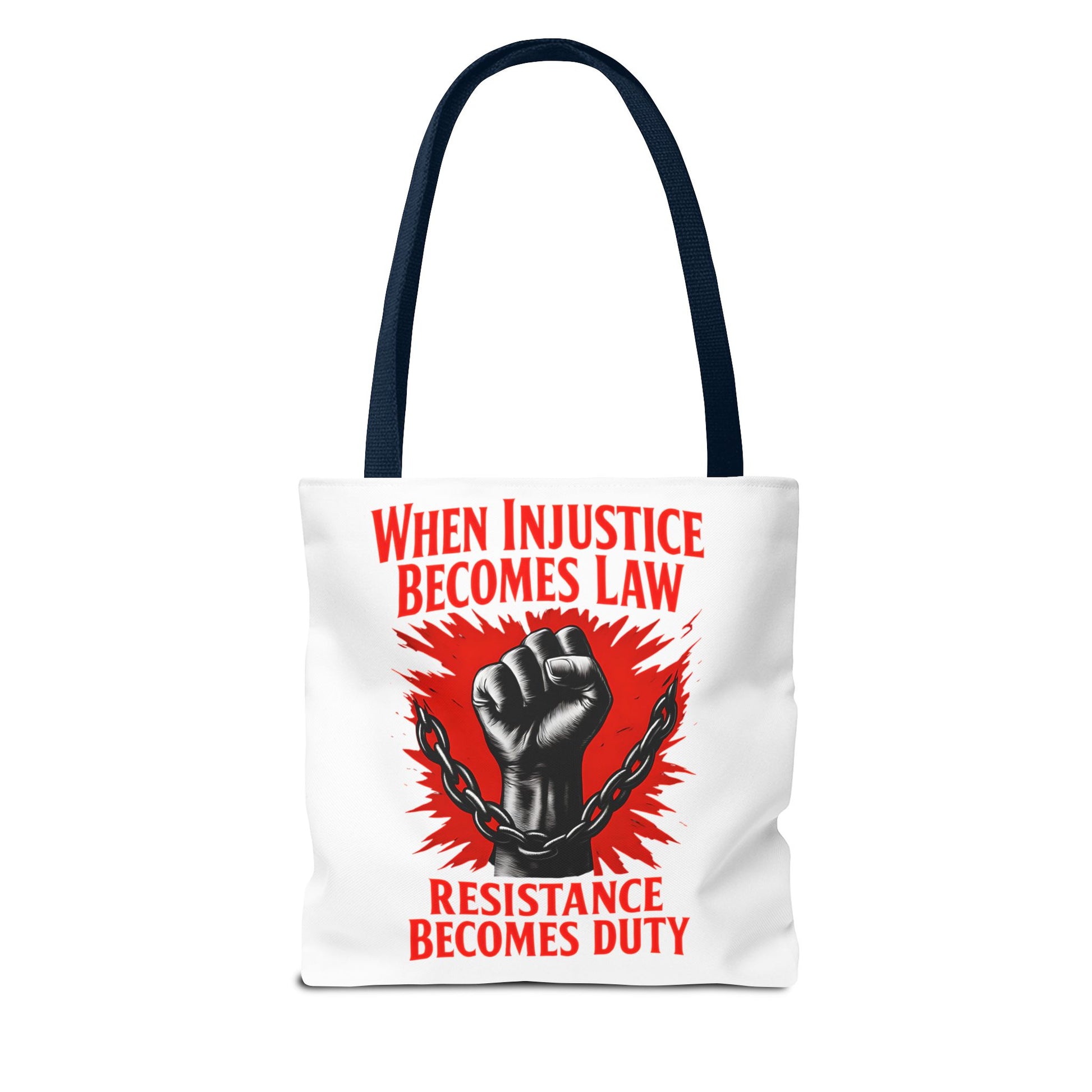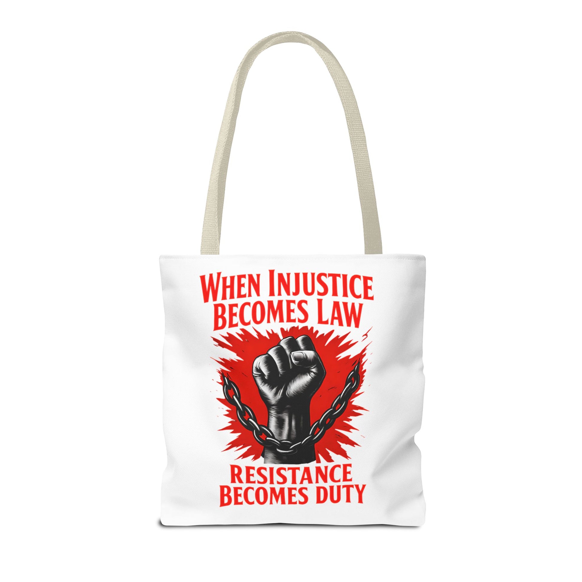 Looking for a tote that speaks volumes without saying too much? Meet our Resistance Duty Tote Bag, your new favorite companion in the fight for justice. This graphic tote bag is more than just a trendy accessory—it's a powerful political statement wrapped gracefully in style. Featuring the impactful mantra "When injustice becomes law, resistance becomes duty," this bag will fuel your determination while keeping your essentials in tow.